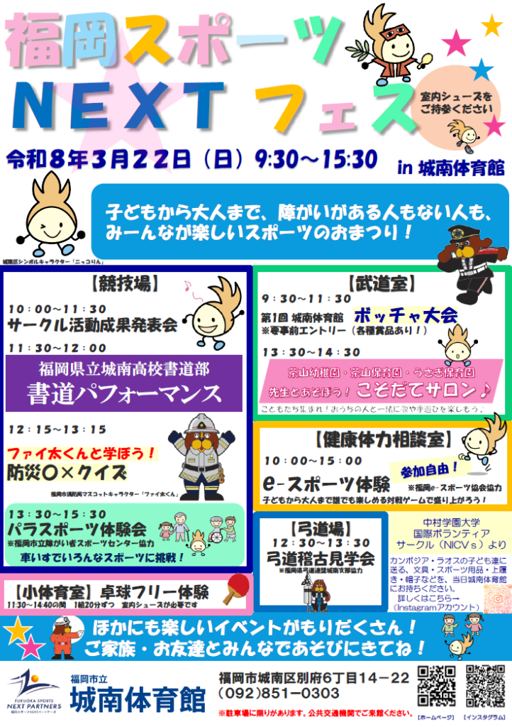 いつも福岡市立城南体育館をご利用いただいている皆様へ、日ごろの感謝の気持ちを込めまして『福岡スポーツNEXTフェス』を開催いたします。