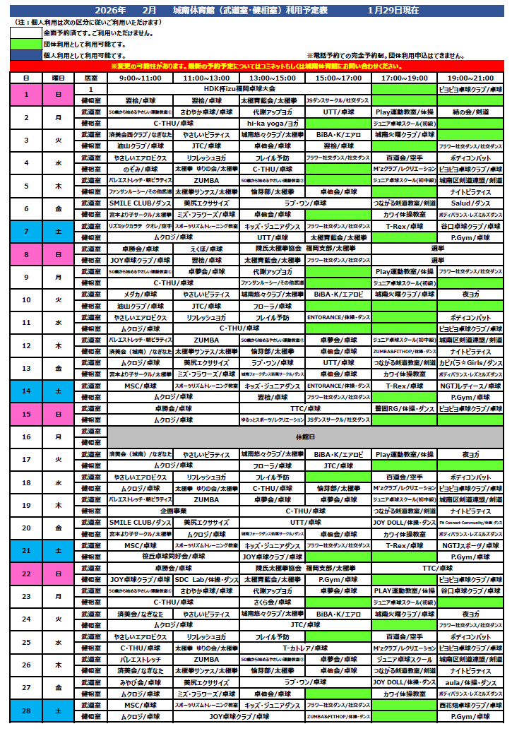 2月度 武道室・健康相談室のスケジュールを更新いたしました。