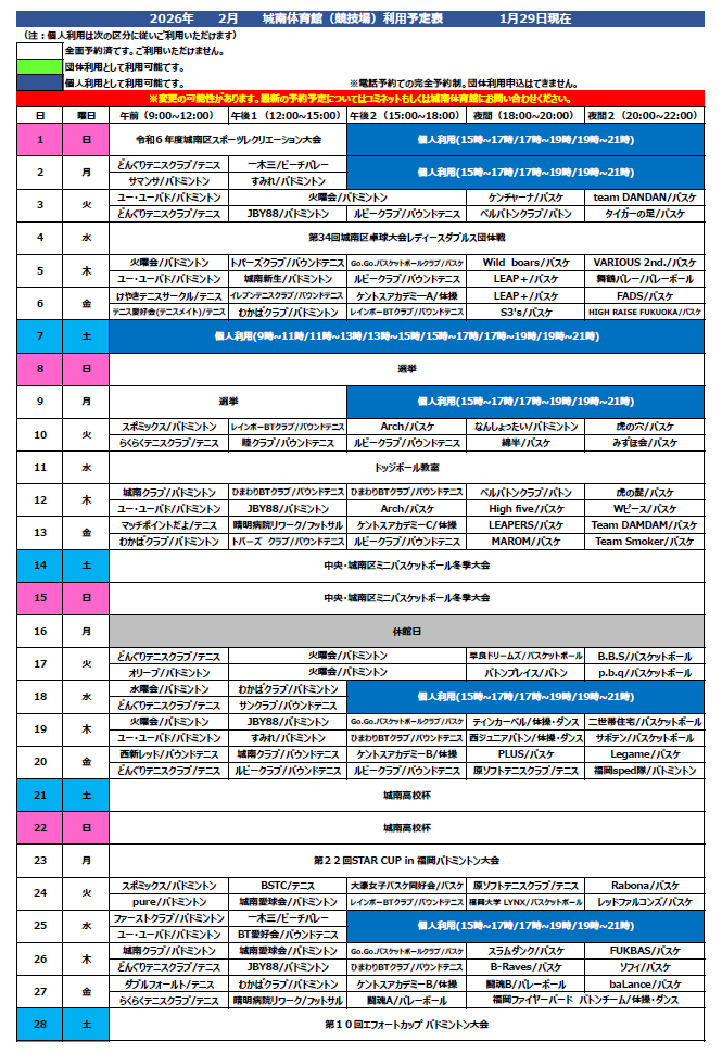 2月度 競技場のスケジュールを更新いたしました。