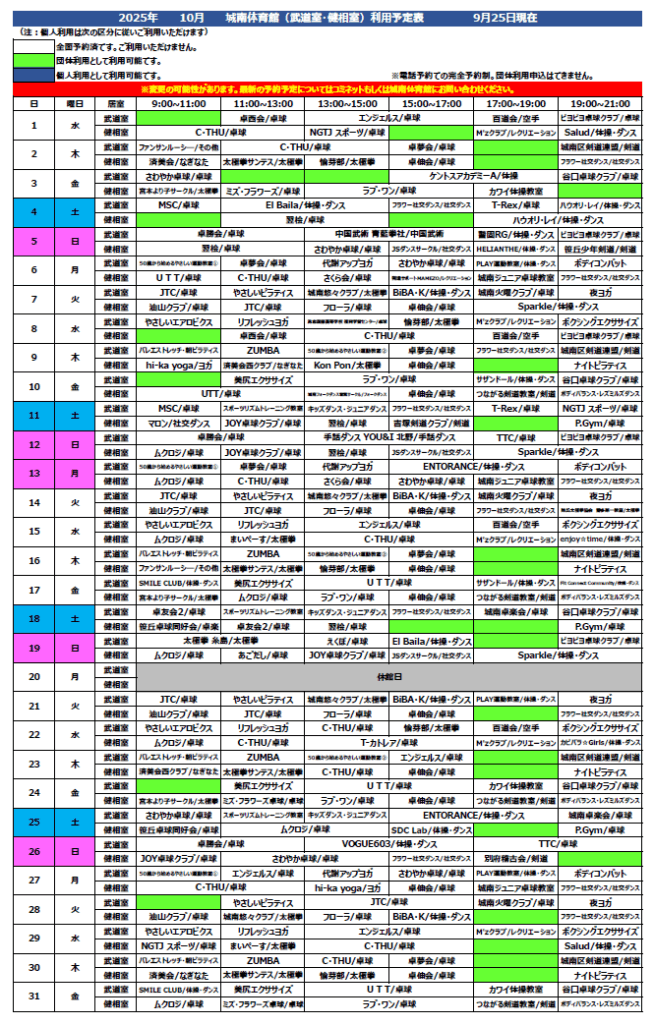 10月度 武道室・健康相談室のスケジュールを更新いたしました。