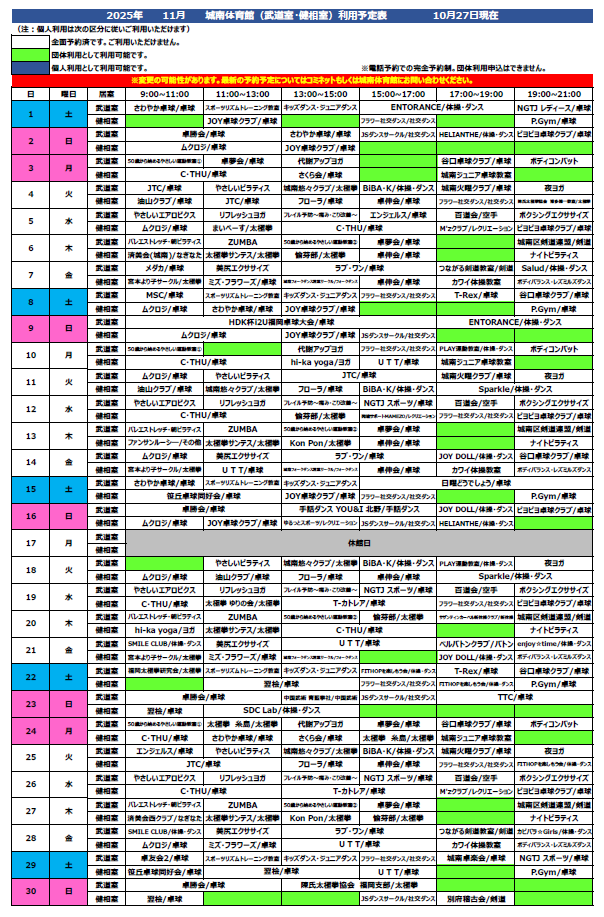 11月度 武道室・健康相談室のスケジュールを更新いたしました。