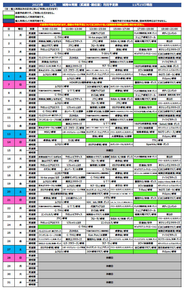 12月度 武道室・健康相談室のスケジュールを更新いたしました。