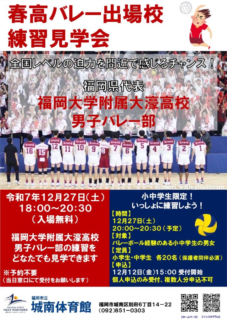 春高バレー(全日本高校バレー選手権)福岡県代表の、福岡大学附属大濠高校 男子バレー部の、大会直前の練習を、城南体育館で見学することができます。