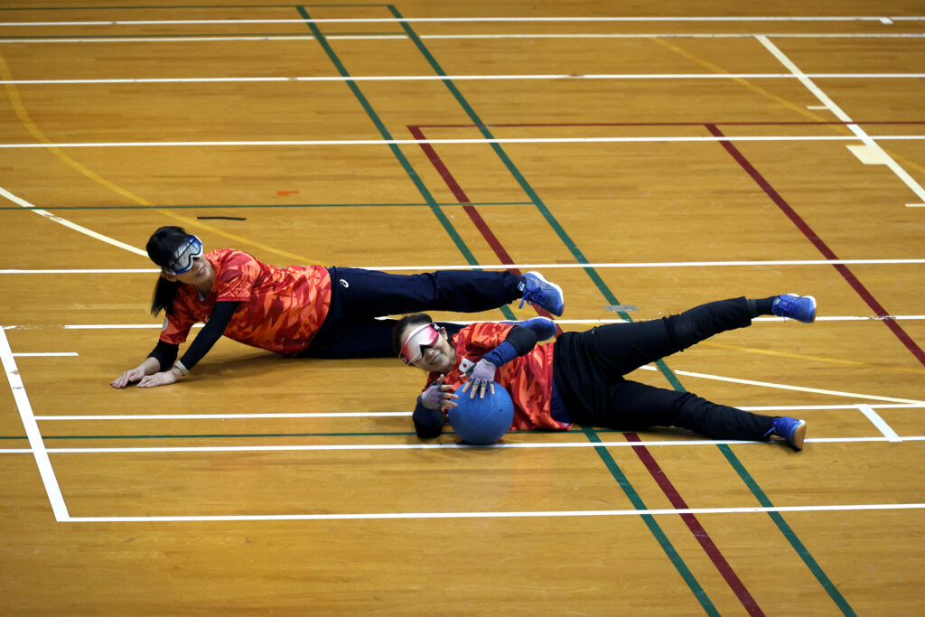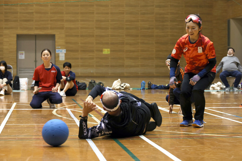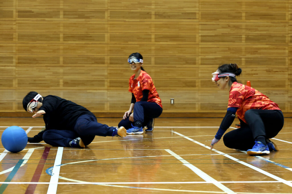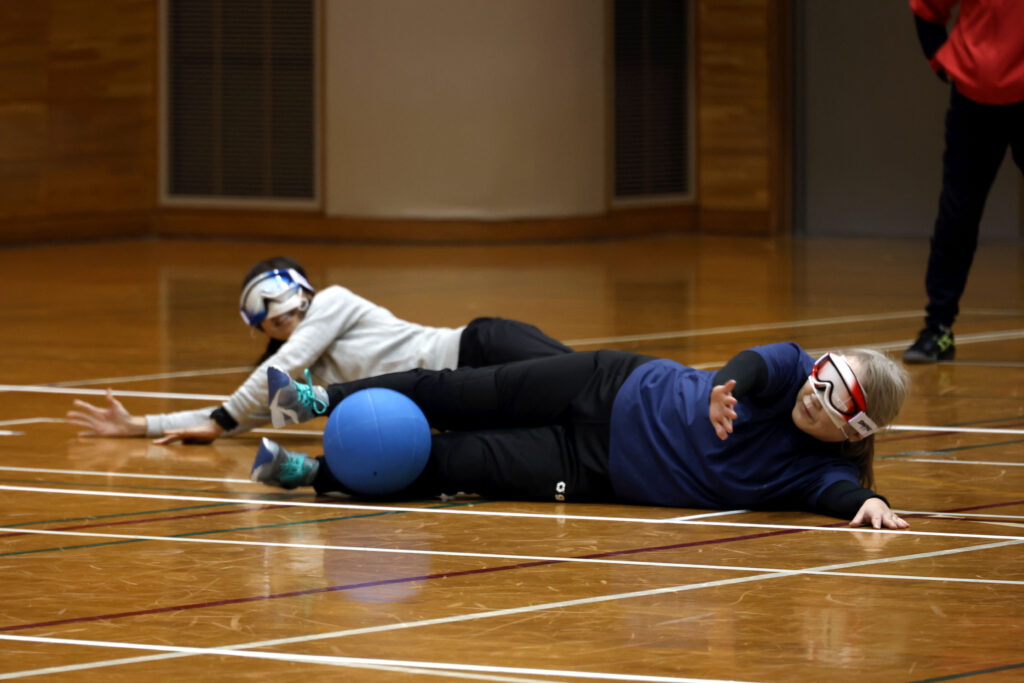 ゴールボールは、目隠しをした状態で鈴の入ったボールの音を頼りにプレーする競技です。