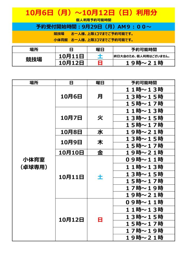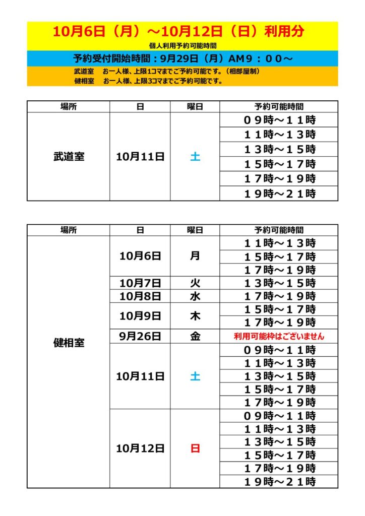 9月29日(月)9:00より、10月6日(月)~10月12日(日)利用分の個人利用予約受付をいたします。
