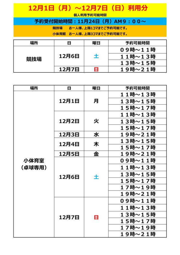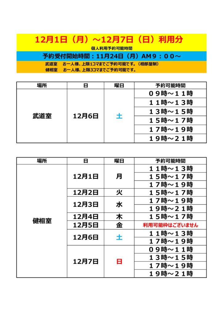 11月24日(月)9:00より、12月1日(月)~12月7日(日)利用分の個人利用予約受付をいたします。