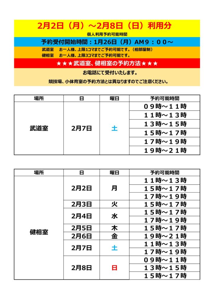 1月26日(月)9:00より、2月2日(月)~2月8日(日)利用分の個人利用予約受付をいたします。