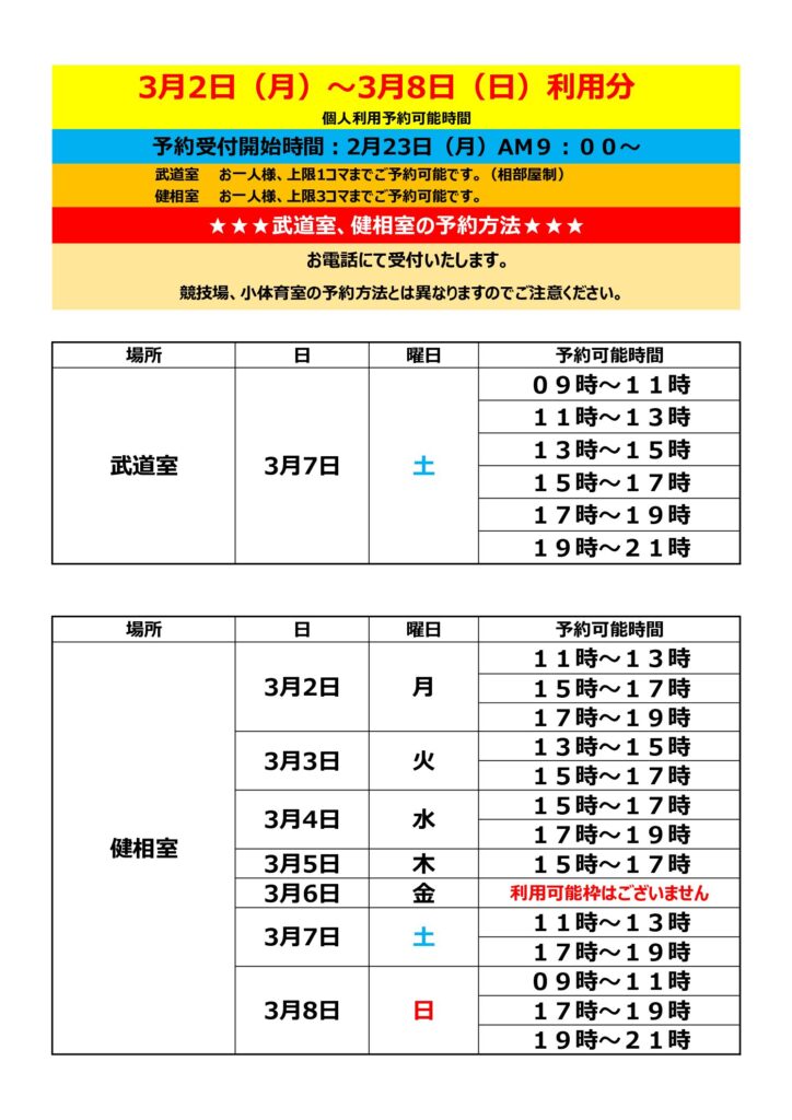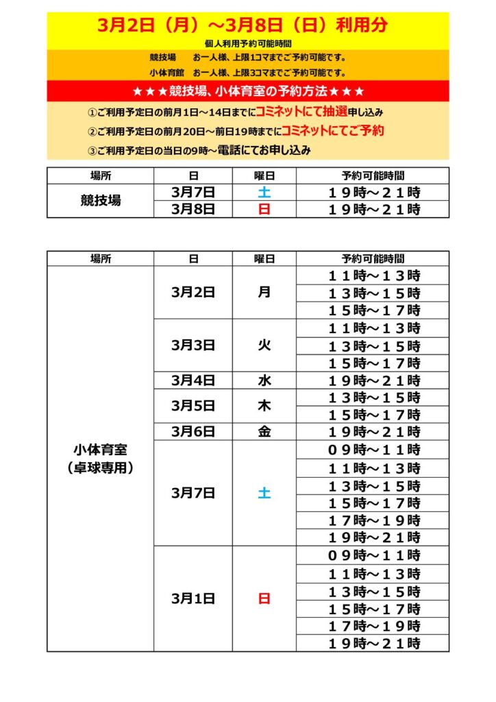 2月23日(月)9:00より、3月2日(月)~3月8日(日)利用分の個人利用予約受付をいたします。