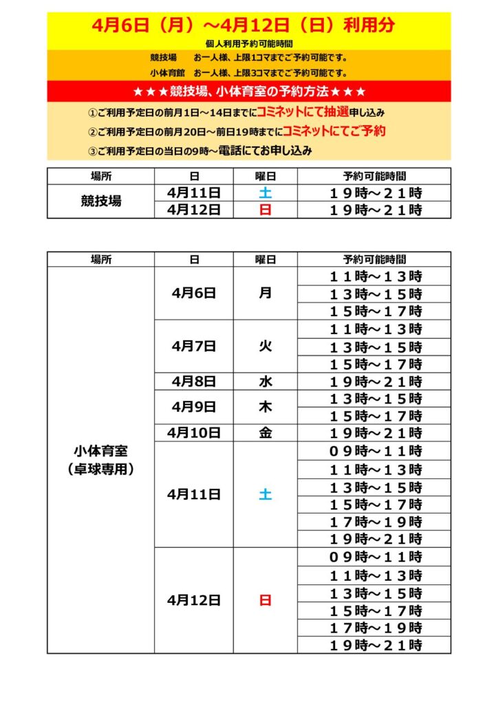 3月30日(月)9:00より、4月6日(月)~4月12日(日)利用分の個人利用予約受付をいたします。