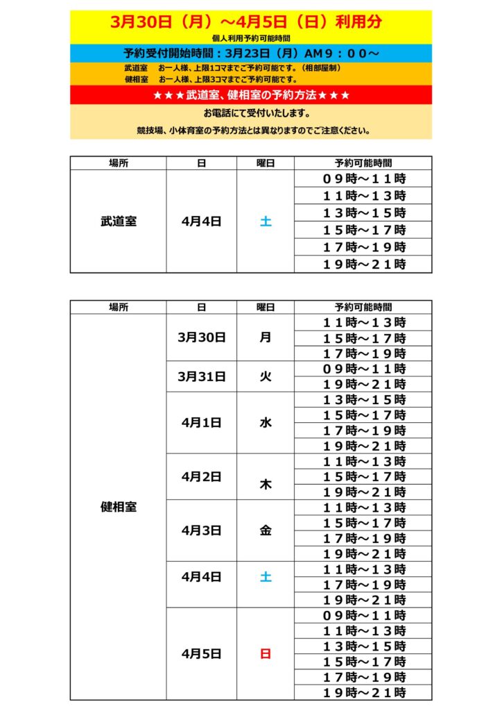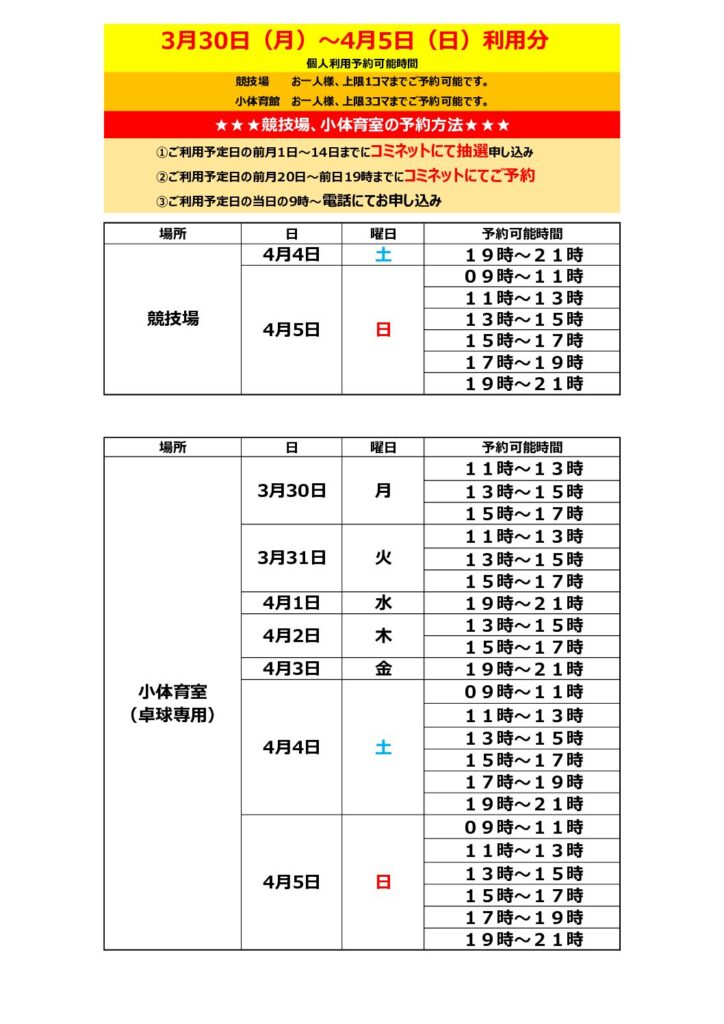 3月23日(月)9:00より、3月30日(月)~4月5日(日)利用分の個人利用予約受付をいたします。