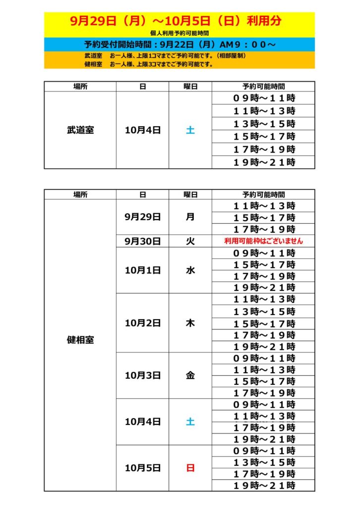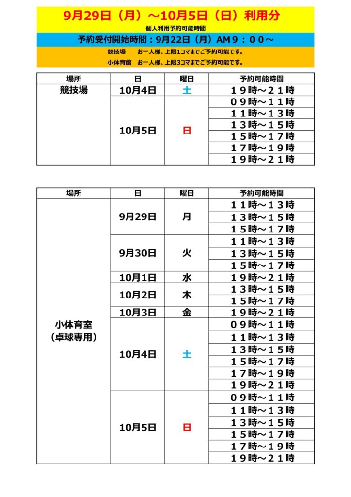 9月22日(月)9:00より、9月29日(月)~10月5日(日)利用分の個人利用予約受付をいたします。